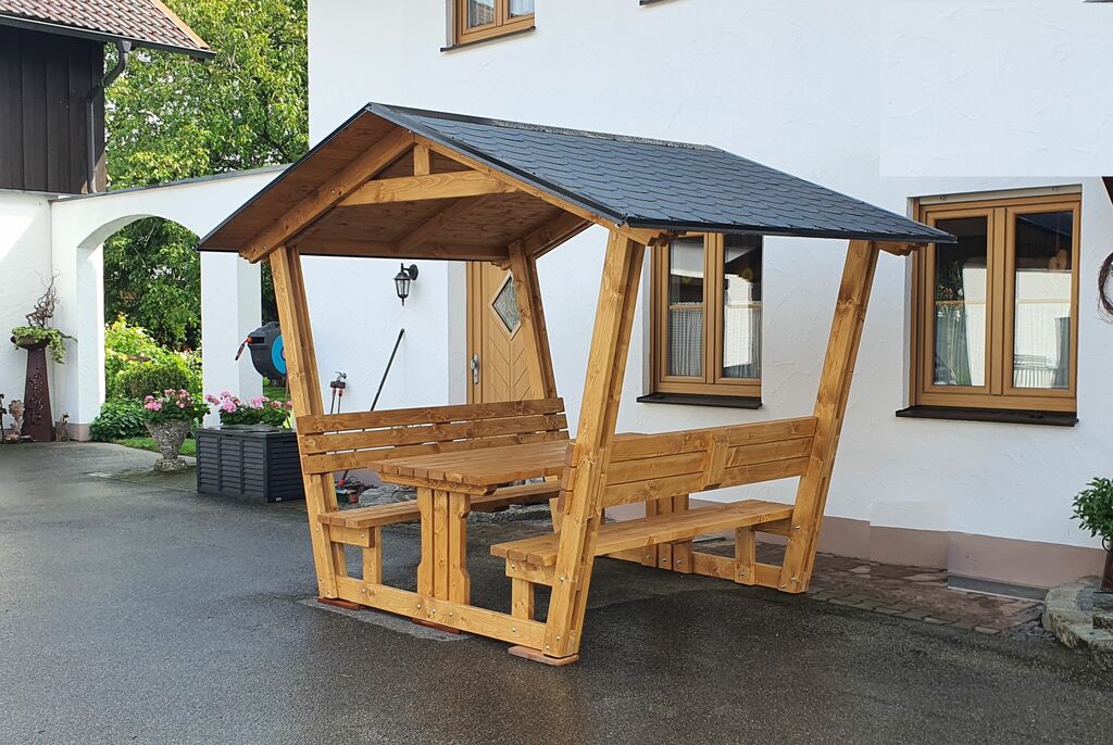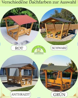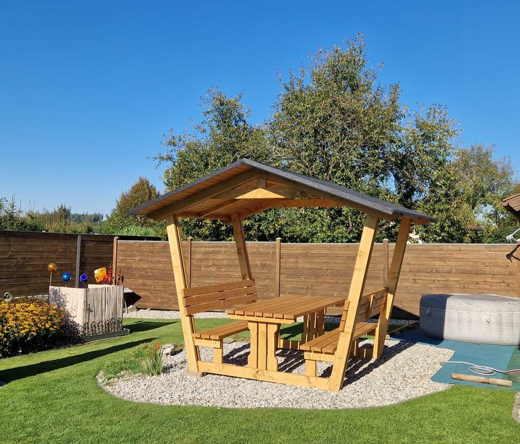 Egal ob in Ihrem Garten, auf der Terrasse oder als Wanderhütte, unsere überdachten Sitzgruppen bieten den perfekten Ort zum Entspannen und Genießen der Natur.